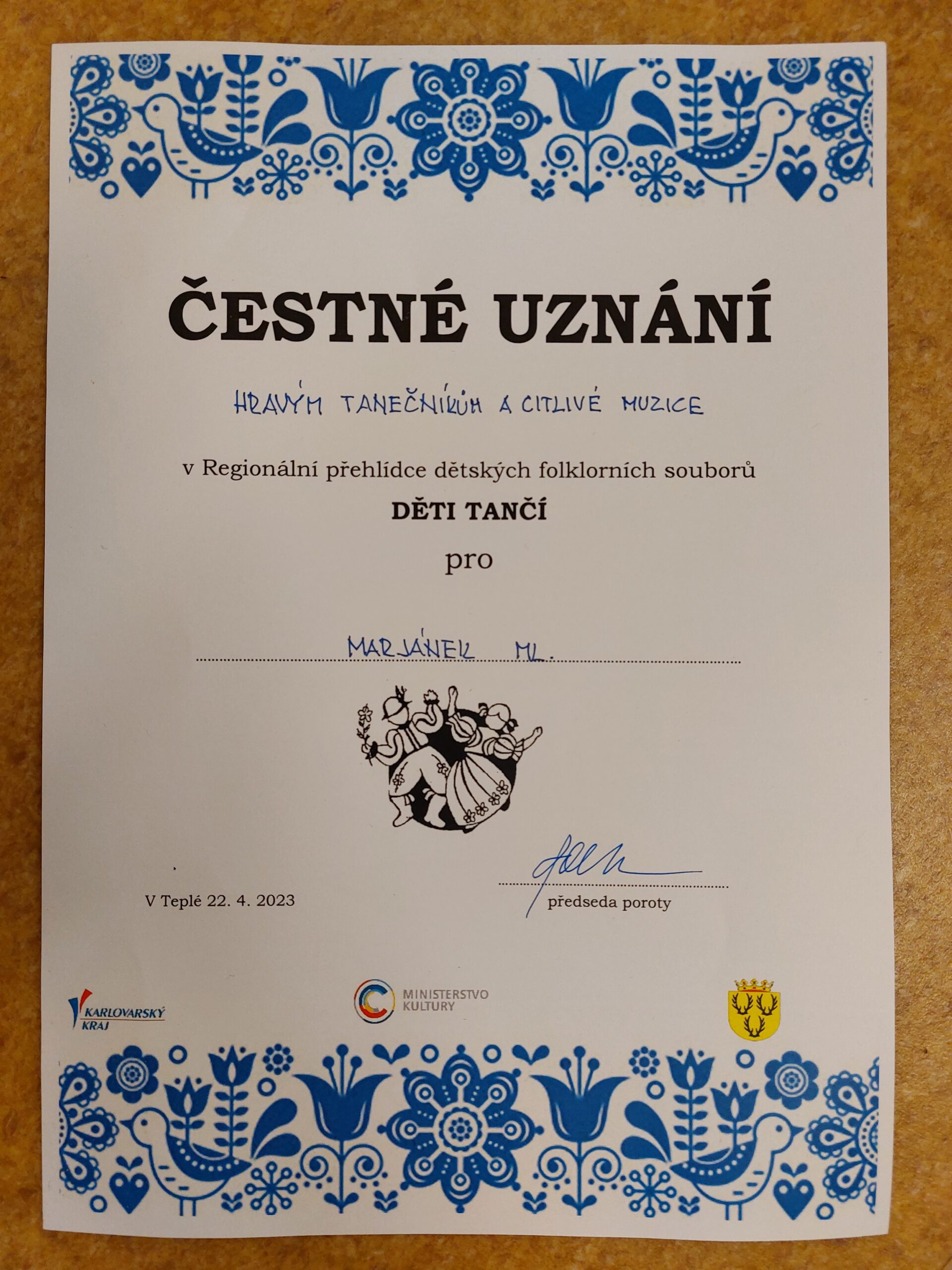 V sobotu 6. dubna se konal jubilejní 20. ročník pěvecké soutěže Zpěváček Karlovarska. V kulturním domě v Teplé se ve dvou kategoriích potkalo celkem 34 dětí od předškolního věku, do 15 let. Šest zpěvaček z Folklorního souboru Marjánek přijelo nasbírat zkušenosti a poměřit své síly. Pilně trénovaly, proto není divu, že i přes velkou konkurenci byly oceněny čestným uznáním, třetím místem a v případě Elišky Vlčkové krásným 2. místem. Jak ale řekl člen poroty, pan Zdeněk Vejvoda, není důležité vyhrát, ale zpívat pro radost. A to se, doufáme, všem účinkujícím podařilo. Děkujeme za krásnou reprezentaci a příjemně strávené dopoledne plné lidových písní.